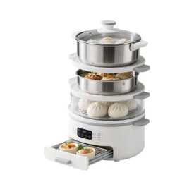 標準的な蒸し器ポットは 2 つまたは 3 つのコンポーネントで構成されています。水を保持するための深い底ポット、穴のあいたインサートまたはバスケット (多くの場合は蓋付き)、および場合によっては積み重ねられる段です。そのメカニズムはシンプルですが、科学的に効果的です。